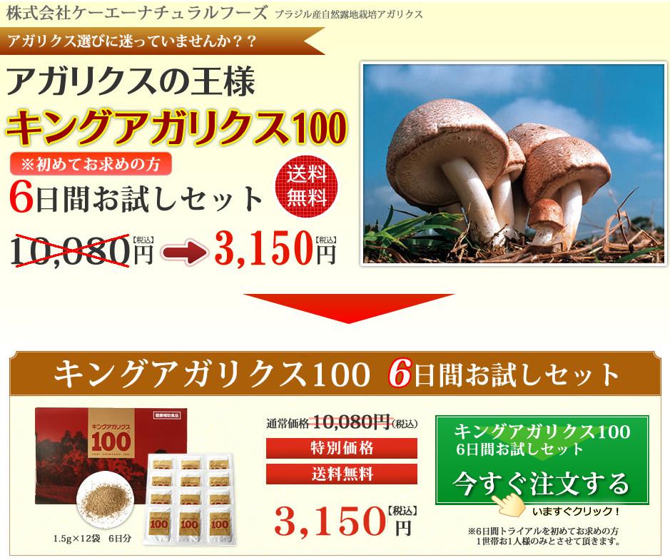 | 商品説明文 | キノコのサプリで最も有名なアガリクス、【キングアガリクス100】お試しセット ≪キングアガリクス≫の特徴 【キングアガリクス100】はブラジル産自然露地栽培アガリクス=キングアガリクスに 現在、6日間お試しキャンペーン中!! |